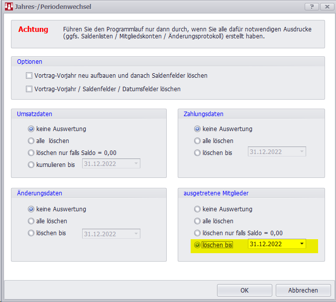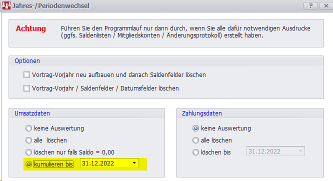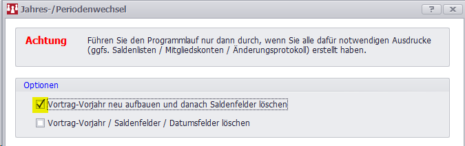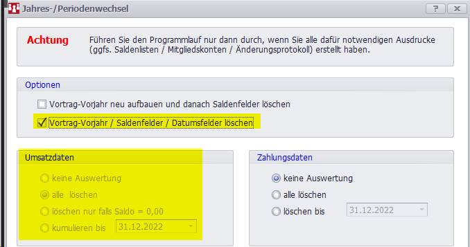 Der Programmlauf sollte erst durchgeführt werden, wenn alle notwendigen Ausdrucke (Verbandsmeldungen, Saldenliste und ggf. Mitgliedskonten) erstellt wurden.