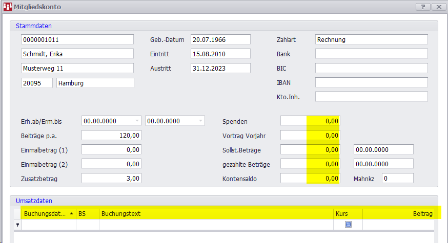Die Saldenfelder (Spenden, Sollst. Beträge und gezahlte Beträge) wurden auf 0.-€ gesetzt. Erst ab dem nächsten Beitragslauf oder einer neuen Spende werden wieder die Felder erneut hochgezählt.