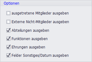 Hinweis: Unabhängig von den gewählten Optionen enthält diese Liste immer Standardangaben wie Mitgliedsnummer, Name, Geschlecht, Anrede sowie das Eintritts- und Austrittsdatum.