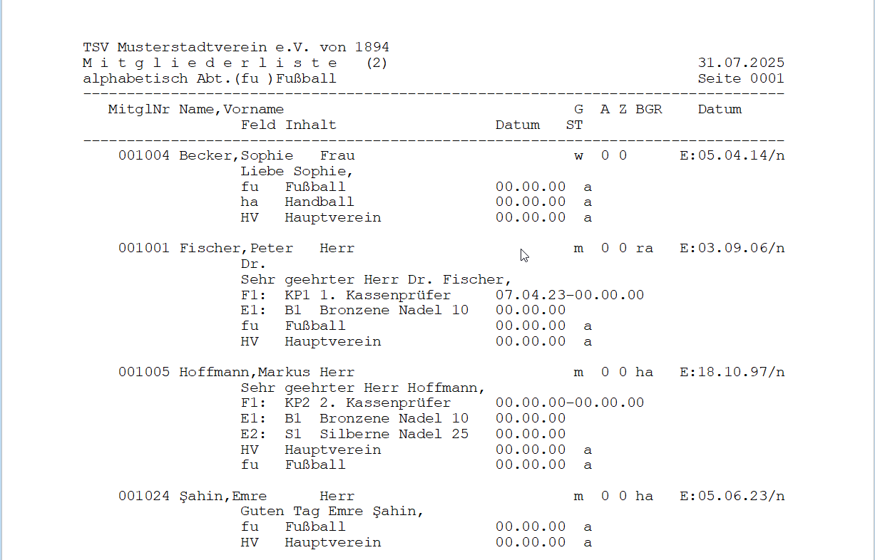 Diese spezielle Liste dient dazu, alle weiteren Stammdaten Ihrer Mitglieder auszugeben, die weder Adress- noch Beitragsdaten sind. Sie ist besonders nützlich, um schnell zu sehen, welche Funktionen und Ehrungen ein Mitglied hat oder welchen Abteilungen es angehört.