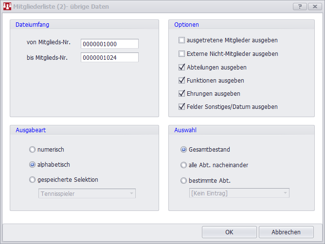 Die Bereiche Dateiumfang, Ausgabeart und Auswahl funktionieren genau wie bei der Adressliste. Sie können damit die gewünschte Mitgliedergruppe eingrenzen und die Sortierung festlegen. So können Sie die Liste beispielsweise nur für die Mitglieder der Abteilung „Tennis“ erstellen und alphabetisch sortieren lassen.