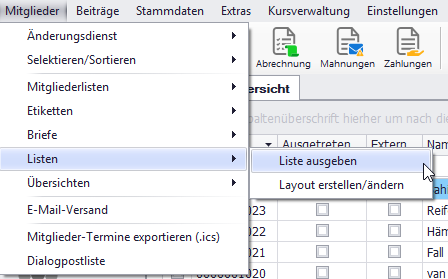 Mit der Funktion Liste ausgeben können Sie gezielt Mitgliederdaten in Listenform ausgeben.