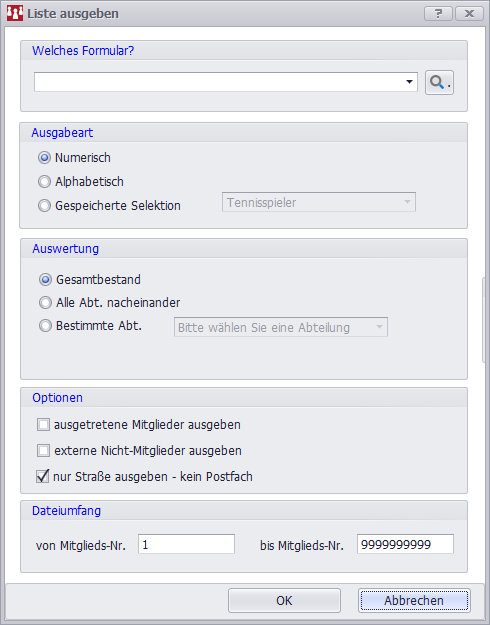 Legen Sie den Bereich der Mitgliedsnummern fest, für die die Liste erstellt werden soll. Standardmäßig werden alle Nummern von 1 bis 999999999 ausgewertet. |