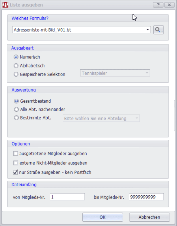 Nach Aufruf der Funktion Listen ausgeben wird folgendes Formular angezeigt.
