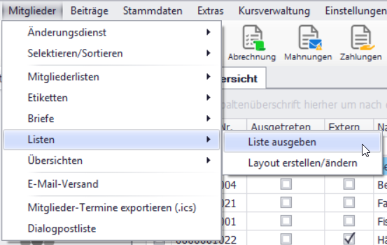 Sofern für die Ausgabe der Listen ein neues oder abgewandeltes Layout gewünscht wird, ist zunächst unter dem Menüpunkt Layout erstellen/ändern die entsprechende Gestaltung vorzunehmen.