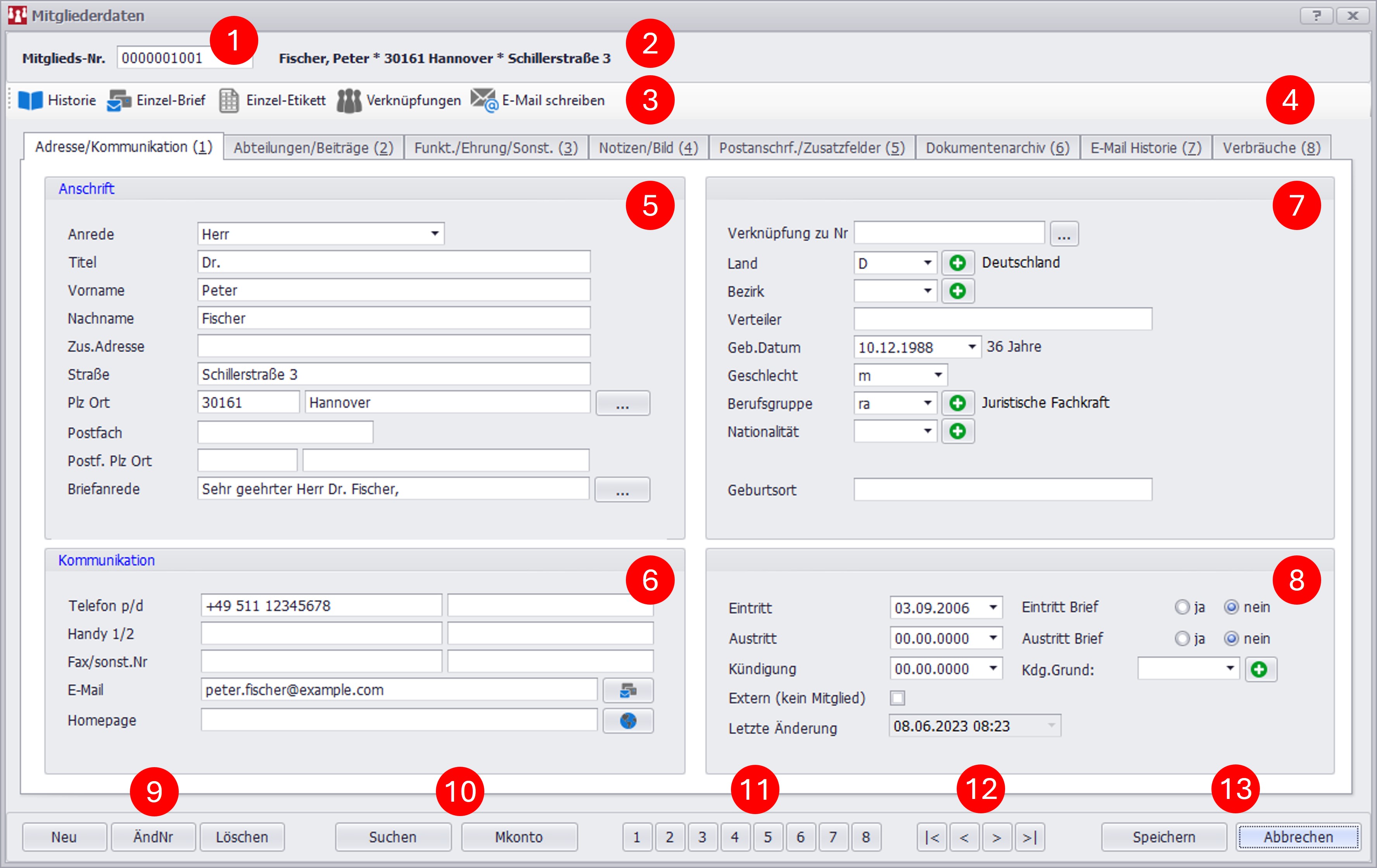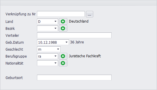 Dieser Abschnitt enthält persönliche Informationen über das Mitglied, die über die reine Adresse hinausgehen. Dazu gehören Geburtsdatum (mit Alter), Geschlecht, Berufsgruppe und Nationalität.