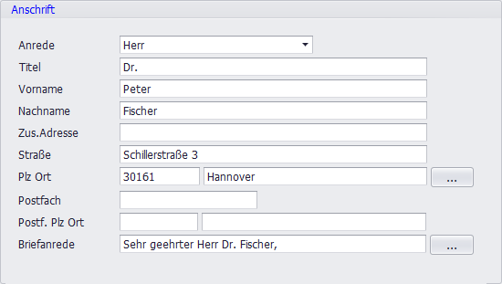 In Bereich werden die detaillierten Adressdaten des Mitglieds erfasst und angezeigt, inklusive Anrede, Titel, Vor- und Nachname sowie die vollständige Adresse. Auch die automatisch erstellte Briefanrede ist hier zu sehen.