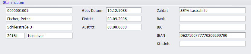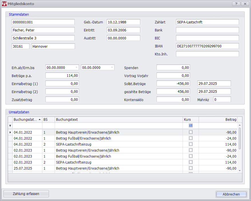 Im oberen Bereich des Fensters sehen Sie die wichtigsten Stamm- und Bankdaten des Mitglieds. Das ermöglicht Ihnen eine schnelle Zuordnung und Überprüfung.