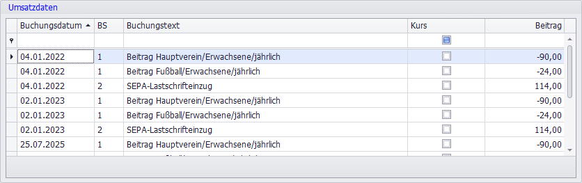 Die Tabelle „Umsatzdaten“ listet alle einzelnen Buchungen für dieses Mitglied in chronologischer Reihenfolge auf. Jede Zeile stellt eine einzelne Transaktion dar.