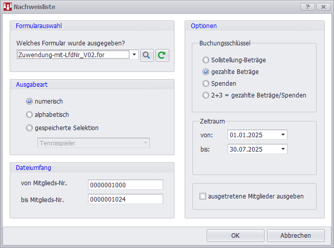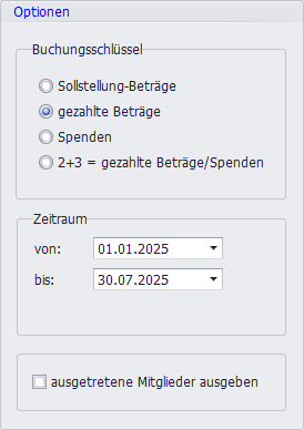 - ausgetretene Mitglieder ausgeben: Setzen Sie hier einen Haken, wenn auch Zuwendungen von bereits ausgetretenen Mitgliedern in die Liste aufgenommen werden sollen.