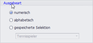 - Ausgabeart: Bestimmen Sie die Sortierung der Liste. Sie können numerisch nach Mitgliedsnummer, alphabetisch nach Namen oder eine zuvor gespeicherte Selektion (z. B. "Tennisspieler") verwenden.