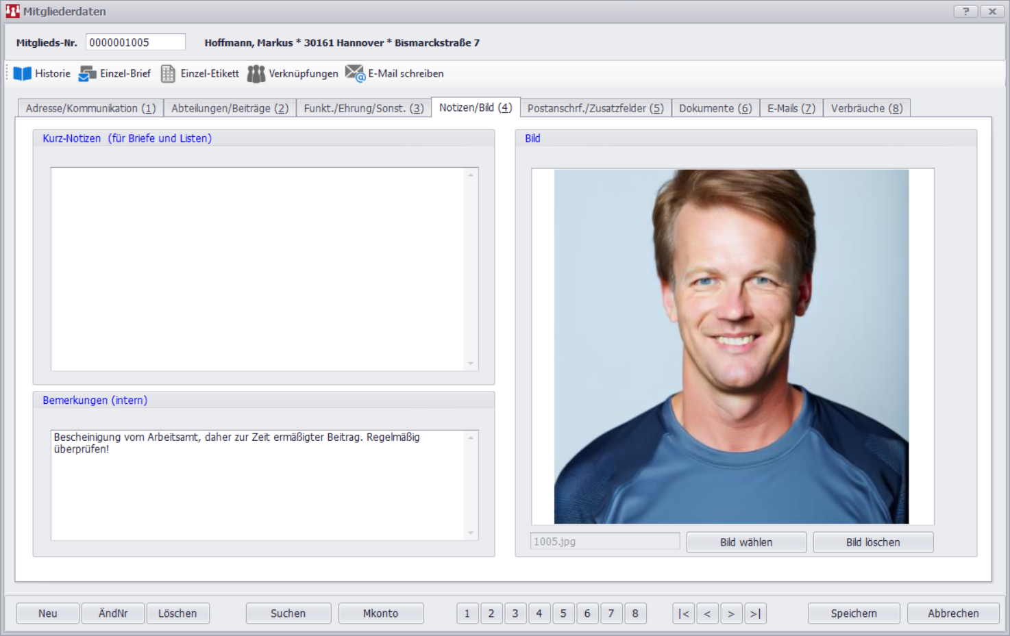 Nach Auswahl eines Mitglieds wechseln Sie auf die Registerkarte Notizen/Bild. Die Felder und Schaltflächen im Überblick: