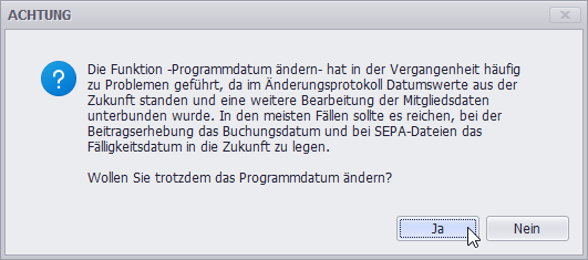 Beachten Sie bitte, dass die Änderung des Programmdatums nur temporär ist. Sobald Sie SPG-Verein 4 schließen und neu starten, wird das Programmdatum automatisch wieder auf das aktuelle Systemdatum Ihres Computers zurückgesetzt.