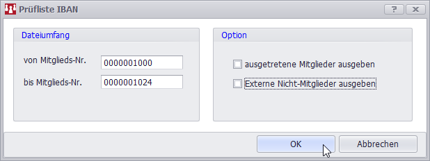 Diese Programmfunktion durchsucht den gesamten Datenbestand des ausgewählten Mandanten auf Korrektheit der IBAN/BIC. Optional können auch die ausgetretenen Mitglieder mit einbezogen werden.