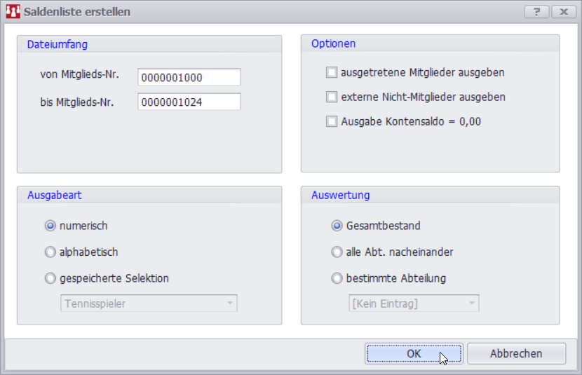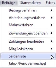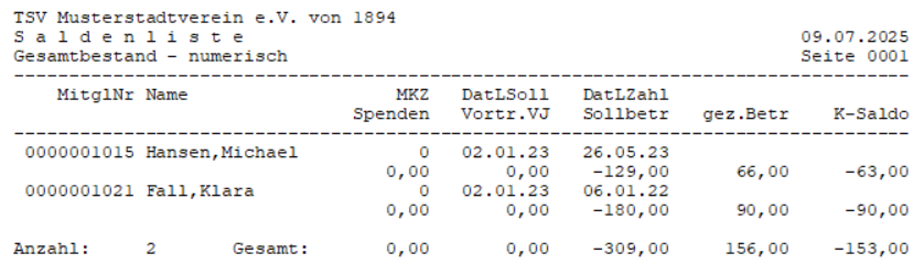 Die Saldenliste ist eine Auswertung, die jederzeit, unabhängig von Abrechnungszyklen, erstellt werden kann. Sie bietet einen aktuellen Überblick über den Stand der Mitgliedsbeiträge sowie die Salden aller Konten im System. Mithilfe dieser Liste lassen sich offene Beträge, Rückstände und Guthaben der Mitglieder schnell erkennen.