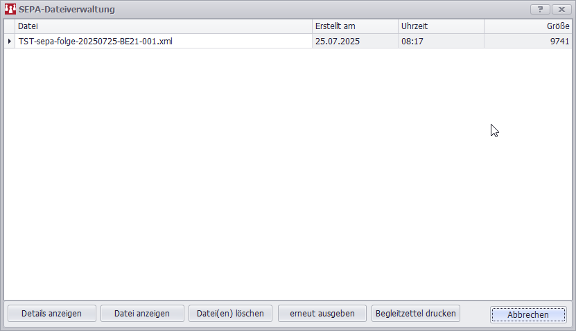 Sie können den Begleitzettel jederzeit über die SEPA-Dateiverwaltung erneut aufrufen und ausdrucken.