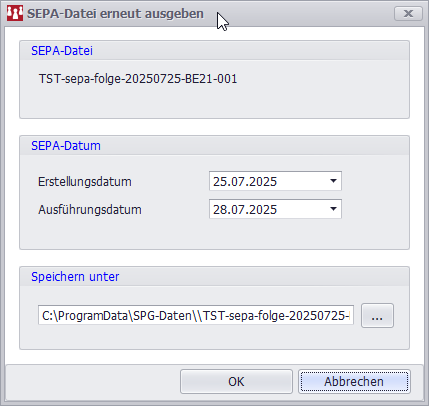 - erneut ausgeben: Speichert die ausgewählte SEPA-Datei noch einmal an einem Ort Ihrer Wahl. Das ist nützlich, wenn die Originaldatei nicht mehr auffindbar ist. Standardspeicherort: C:\ProgramData\SPG-Daten