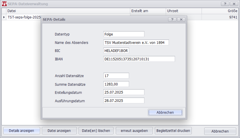 - Details anzeigen: Zeigt Ihnen grundlegende Informationen zur ausgewählten SEPA-Datei an.