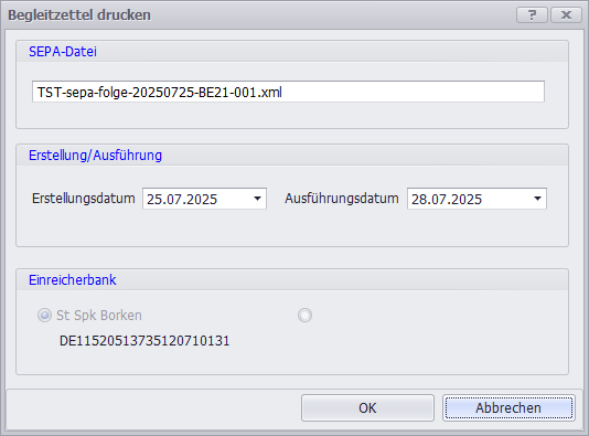 - Begleitzettel drucken: Zeigt den Begleitzettel zur ausgewählten SEPA-Datei an und ermöglicht Ihnen, diesen erneut auszudrucken.