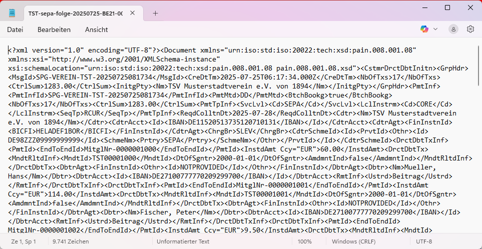 - Datei anzeigen: Öffnet die ausgewählte SEPA-XML-Datei in einem Texteditor, sodass Sie den Inhalt einsehen können.