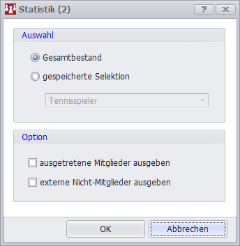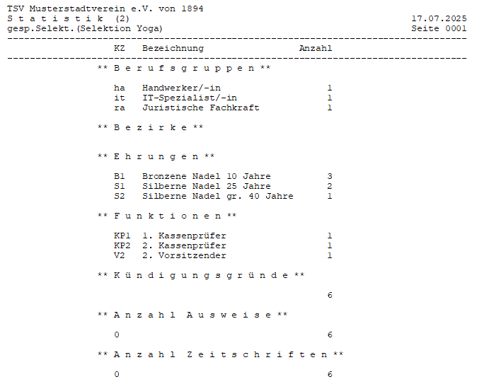 Mit der Funktion „Statistik (2)“ werten Sie Ihre Mitgliederdaten nach verschiedenen organisatorischen Merkmalen aus. Im Gegensatz zur allgemeinen Mitgliederstatistik, die sich auf Alter und Abteilungen konzentriert, erhalten Sie hier Übersichten zu Stammdaten wie Funktionen, Ehrungen, Bezirken oder Berufsgruppen.