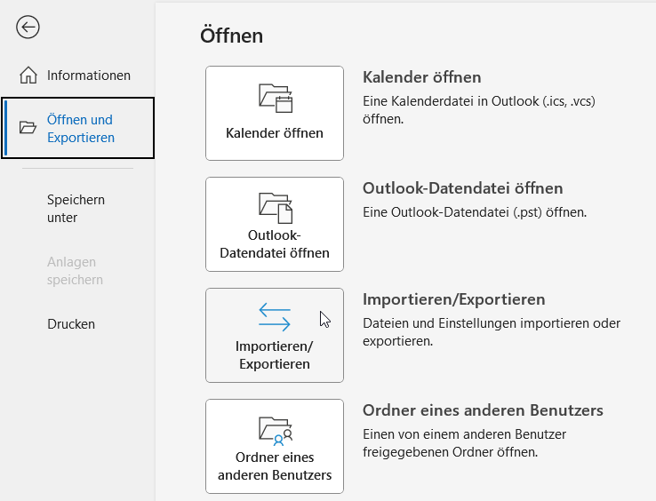 Starten Sie Microsoft Outlook und klicken Sie auf Datei > Öffnen und exportieren > Importieren/Exportieren