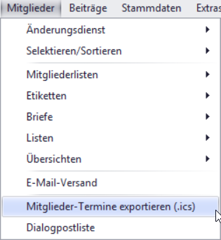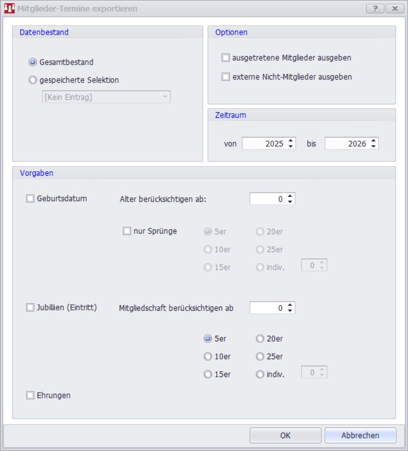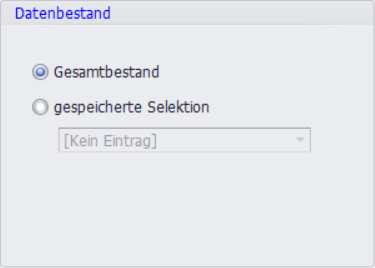 Wählen Sie hier den entsprechenden Datenbestand, der als Termin exportiert werden soll. Sie haben die Möglichkeit, die gesamten Mitgliedertermine zu exportieren (Gesamtbestand) oder die Termine der Mitglieder innerhalb einer gespeicherten Selektion zu exportieren. |