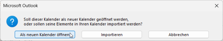 Wenn Sie erfolgreich eine .ics-Datei erzeugt haben, können Sie diese importieren. In diesem Beispiel wird der .ics-Import anhand von Microsoft Outlook beschrieben.
