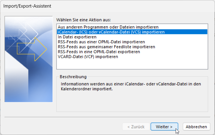 Wählen Sie iCalendar-(ICS) oder vCalendar-Datei (VCS) importieren und klicken Sie auf Weiter