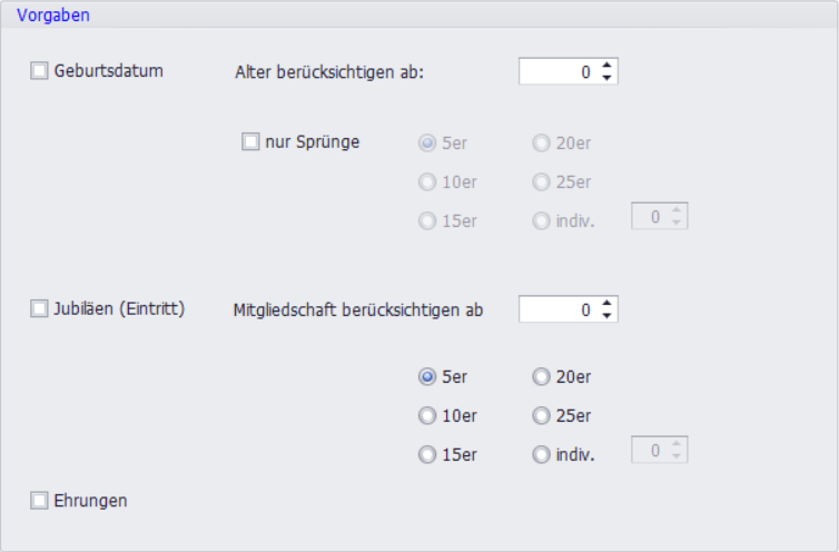 Jubiläen (Eintritt): Es kann festgelegt werden, ab wie vielen Jahren Mitgliedschaft ein Jubiläum berücksichtigt werden soll. Nutzen Sie hierfür die verschiedenen Intervalle (z.B. 10 jähriges Jubiläum).