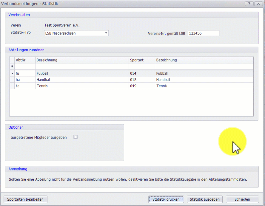 Hier können Sie die Verbandsmeldungen vorbereiten, ausdrucken und als Datei für den Landessportbund (LSB) auf Ihrer Festplatte speichern.