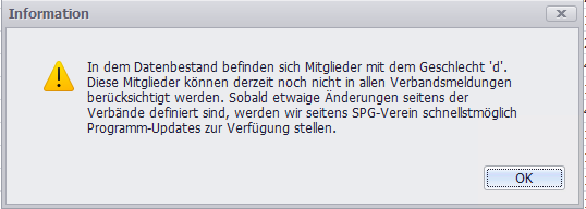 Sie erhalten diesen Hinweis, weil in Ihrem Mitgliederbestand Personen mit dem Geschlechtseintrag 'd' (für divers) erfasst sind. Das Programm möchte Sie proaktiv darauf aufmerksam machen, dass dies Auswirkungen auf die Meldungen an Ihre Sportverbände hat.