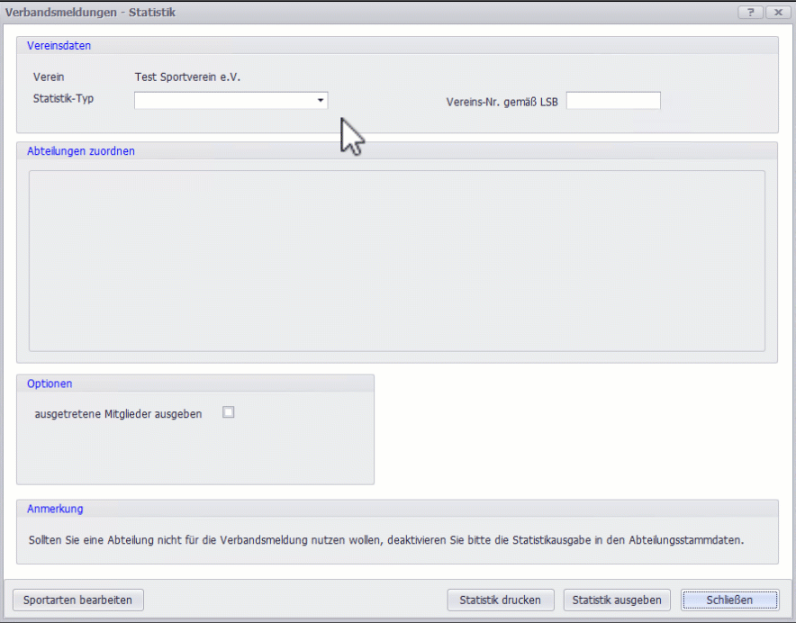 Indem Sie hier Ihren zuständigen Verband auswählen, stellen Sie sicher, dass SPG-Verein 4 die Statistikdatei im exakt richtigen Format für eine reibungslose und fehlerfreie Übermittlung erstellt.