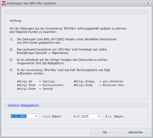 Wenn Sie für Ihre Finanzbuchhaltung das Programm SPG-Fibu nutzen, können Sie Buchungen wie Beiträge, Gebühren, Spenden oder Rücklastschriften direkt von dort in die Mitgliedskonten von SPG-Verein 4 übernehmen. Das spart Ihnen die doppelte Erfassung.