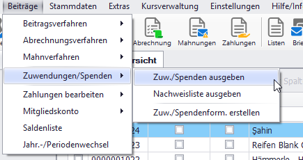 Menüleiste: Beiträge > Zuwendungen/Spenden > Zuw./ Spenden ausgeben