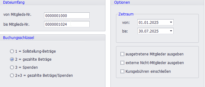 - Dateiumfang: Geben Sie einen bestimmten Bereich von Mitgliedsnummern an, um die Ausgabe einzuschränken.