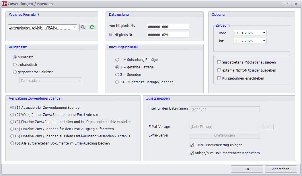 Hier können Sie die Ausgabe Ihrer Spendenbescheinigungen detailliert steuern. Sie legen fest, welches Formular verwendet wird, welche Mitglieder berücksichtigt werden sollen und wie die Ausgabe erfolgen soll.