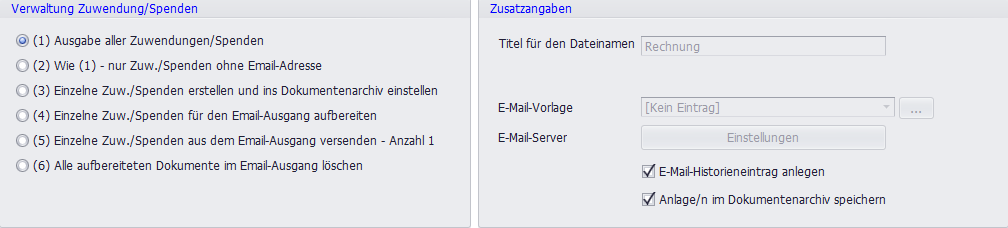 - (5) Einzelne Zuw./Spenden aus dem E-Mail-Ausgang versenden: Direktversand aus dem E-Mail-Ausgang.